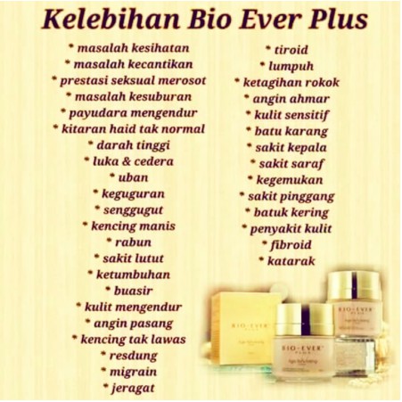 Kebaikan krim bio ever plus · kaya dengan anti penuaan · kulit licin dan cantik · meningkatkan stamina dan tenaga · pulihkan sistem saraf. Ia juga merangsang sintesis kolagen kaya dengan diosgenin kolagen yang boleh mengaktifkan hormon, membantu… Krim bio ever plus bio ever plus adalah krim kecantikan dan kesihatan yang dicipta untuk menstabilkan tindak balas hormon di dalam badan melalui tindakbalas semulajadi dan selamat. Bio ever plus, penang island. Pegaga (centellaasiatica) kaya dengan vitamin a dan c.